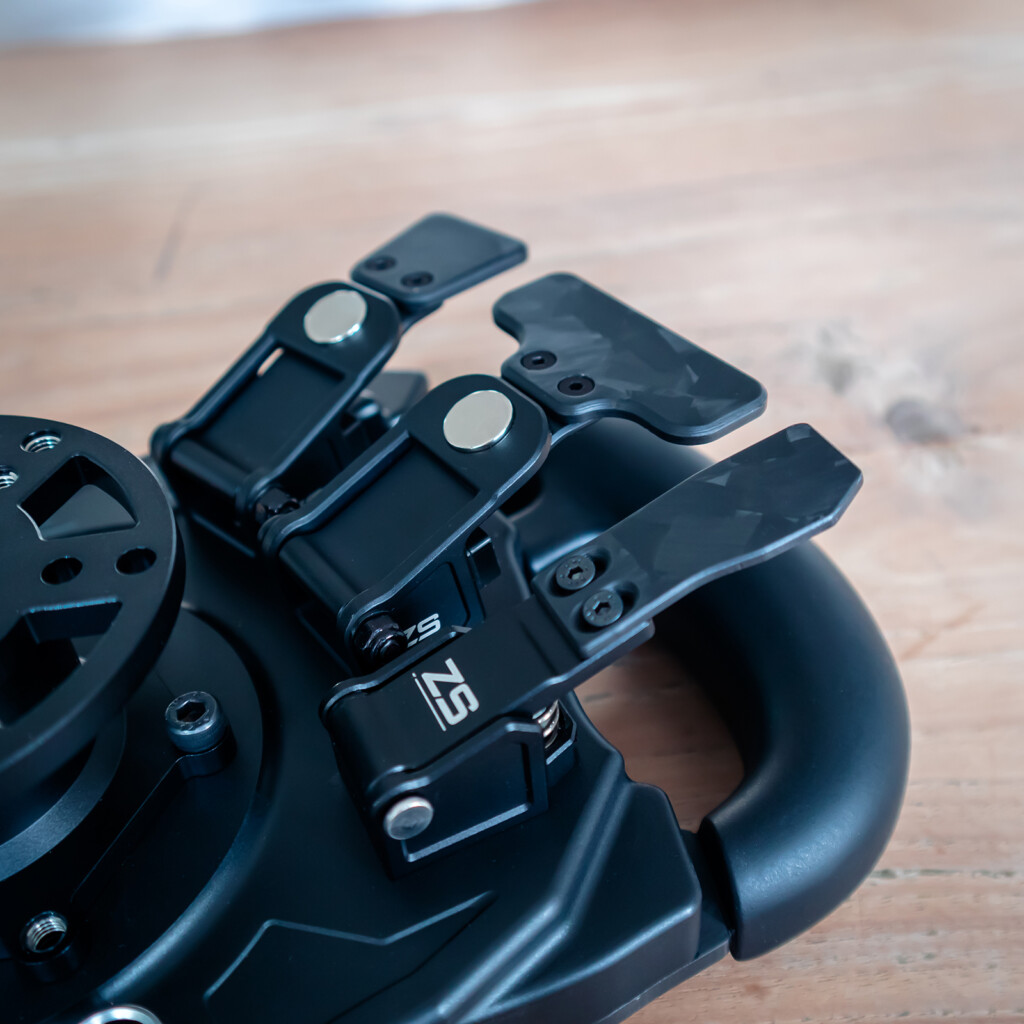 Een van de eerste dingen die ons opvalt aan het Zen’s Simwheels UNIFLEX ELITEx stuurwiel is de solide bouwkwaliteit van de modules aan de achterkant. De schakelmodules zitten precies goed ter hoogte van onze middelvingers. Ze hebben een korte en strakke slag, waardoor we snel en precies schakelen. Daarbij geven ze een fijne klik als feedback, zonder dat ze overdreven luid zijn.