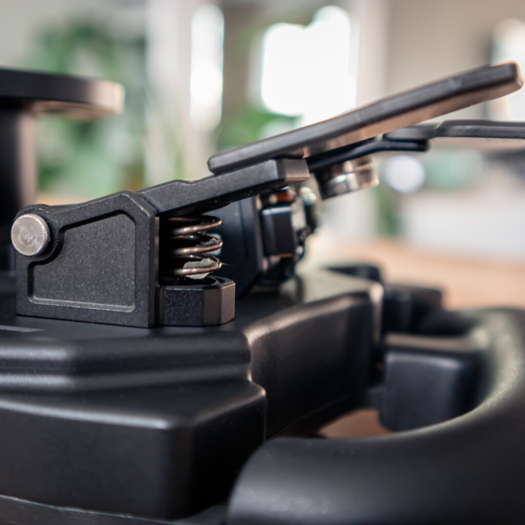 Onder de schakelaars vinden we de twee analoge modules van het stuur. Deze hebben logischerwijs een grotere slag en voelen prettig aan in gebruik. Standaard zit er een stevige veer in, waardoor ze best wat weerstand geven en in het begin wat zwaar aanvoelen. Gelukkig hebben we van Zen’s Simwheels ook nog twee lichtere veren meegekregen. Met die lichtere variant gaat het een stuk soepeler en kunnen we de analoge paddles veel nauwkeuriger bedienen – ideaal bijvoorbeeld bij de start van een race. De contactloze hall-effect sensoren zorgen ervoor dat alles vloeiend en zonder frictie wordt geregistreerd.