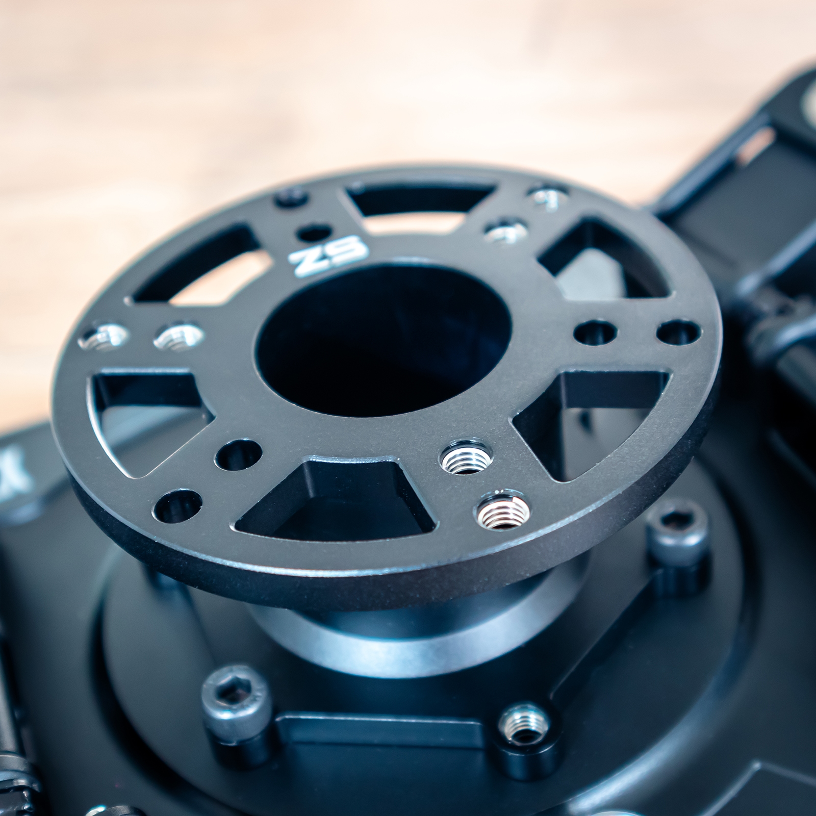 We monteren het Zen’s Simwheels UNIFLEX-ELITEx stuurwiel op onze Simucube 2 Sport wheelbase en bevestigen hiervoor een Simucube Quick-Release op de aluminium hub aan de achterzijde. Dit is eenvoudig te doen met de meegeleverde M5-boutjes. Hoewel de Quick-Release direct op het stuurwiel gemonteerd kan worden, kiezen we ervoor om een hub te gebruiken tussen het stuur en de wheelbase. Dit zorgt voor net wat meer ruimte en sluit beter aan bij onze setup. Na de montage sluiten we de datakabel van het stuur aan en verbinden we de USB-connector met een vrije poort op onze USB-hub. Daarna configureren we het Zen’s Simwheels UNIFLEX-ELITEx stuurwiel in SimHub.