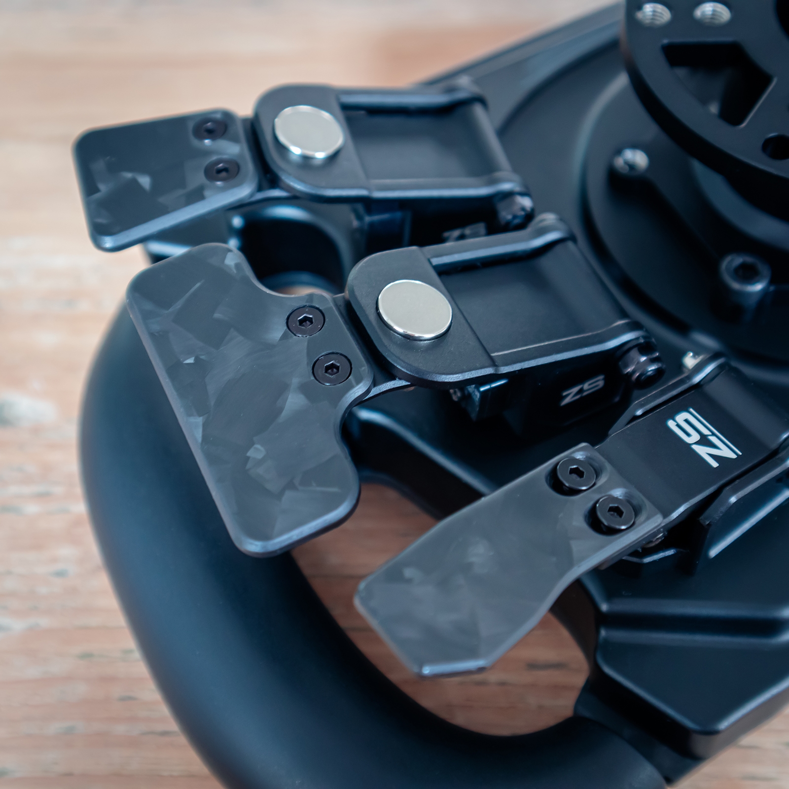 Onder de schakelaars vinden we de twee analoge modules van het stuur. Deze hebben logischerwijs een grotere slag en voelen prettig aan in gebruik. Standaard zit er een stevige veer in, waardoor ze best wat weerstand geven en in het begin wat zwaar aanvoelen. Gelukkig hebben we van Zen’s Simwheels ook nog twee lichtere veren meegekregen. Met die lichtere variant gaat het een stuk soepeler en kunnen we de analoge paddles veel nauwkeuriger bedienen – ideaal bijvoorbeeld bij de start van een race. De contactloze hall-effect sensoren zorgen ervoor dat alles vloeiend en zonder frictie wordt geregistreerd.